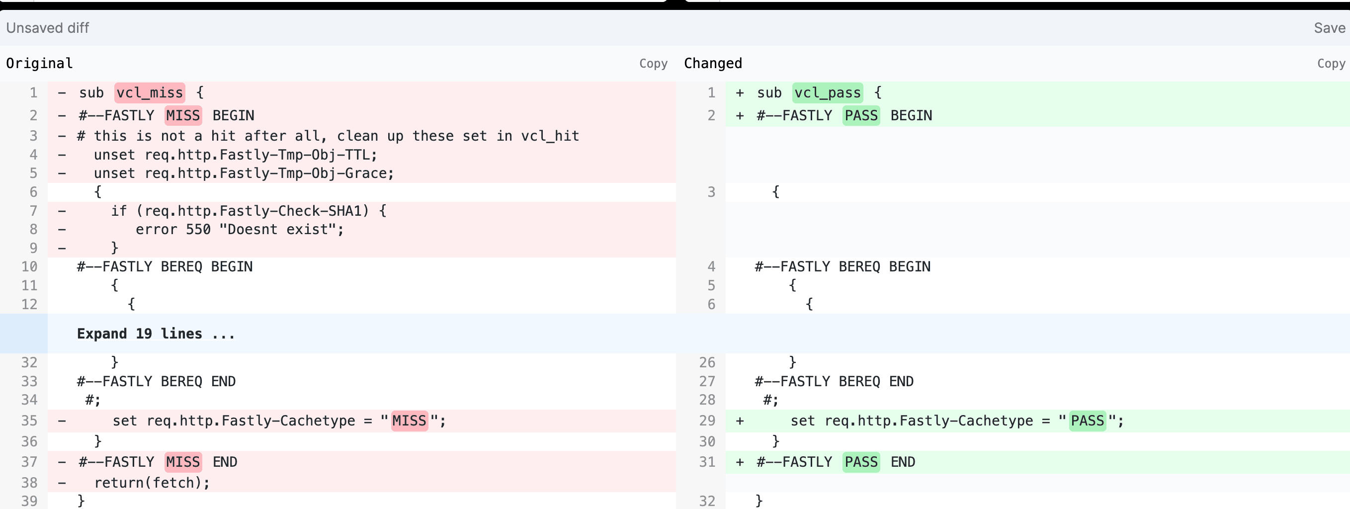 Unsetting of those temporary TTLs and temporary grace request headers, they’re not being unset in pass. Those may be passed to the origin. Also, we don’t have the Fastly check SHA1 in place. That’s also been removed. The other thing to point out that’s missing is looking at the end of VCL pass, there’s no default return pass present. Even though it was listed on our diagram there, it’s not actually present and it doesn’t need to be. For the case of VCL pass, the default transition call is there in the background. Since there’s literally only one way to transition out of this subroutine except from error, really the only call is going to be return pass