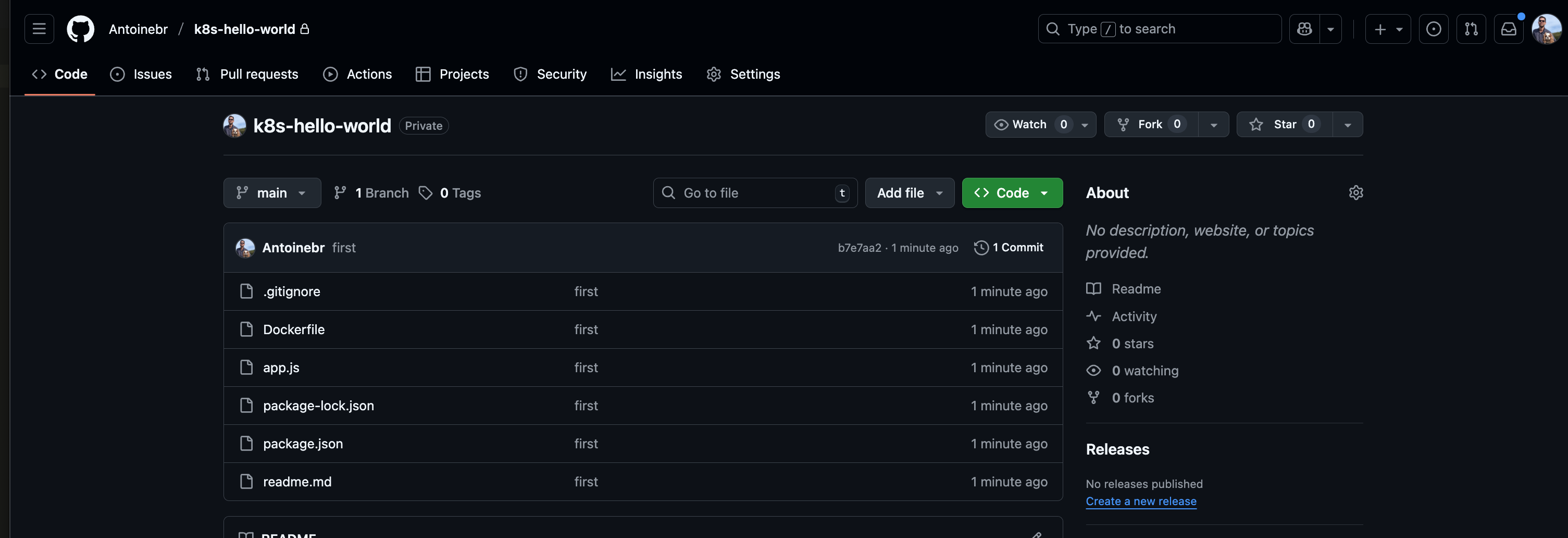 git commit -m "Initial commit: hello world app + Dockerfile"