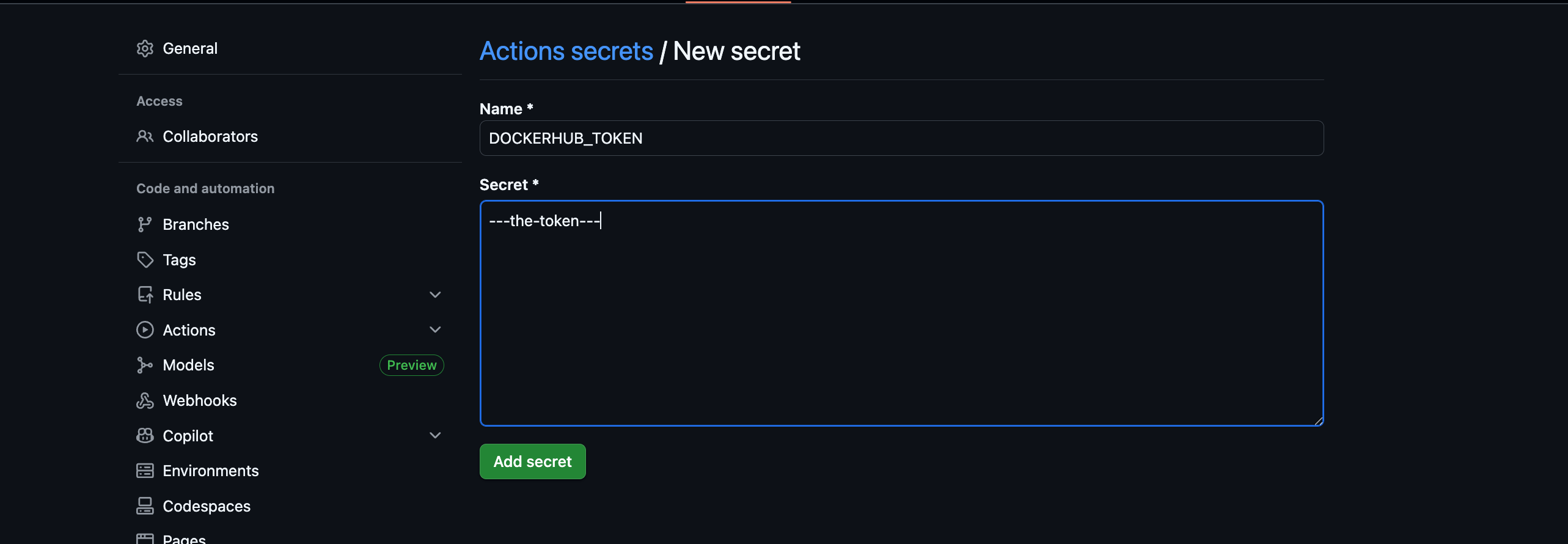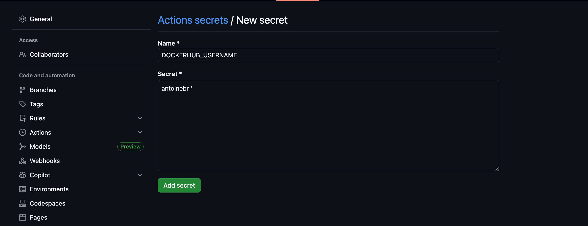 - Add Secrets: The GitHub Action will need to log in to Docker Hub to push your image.