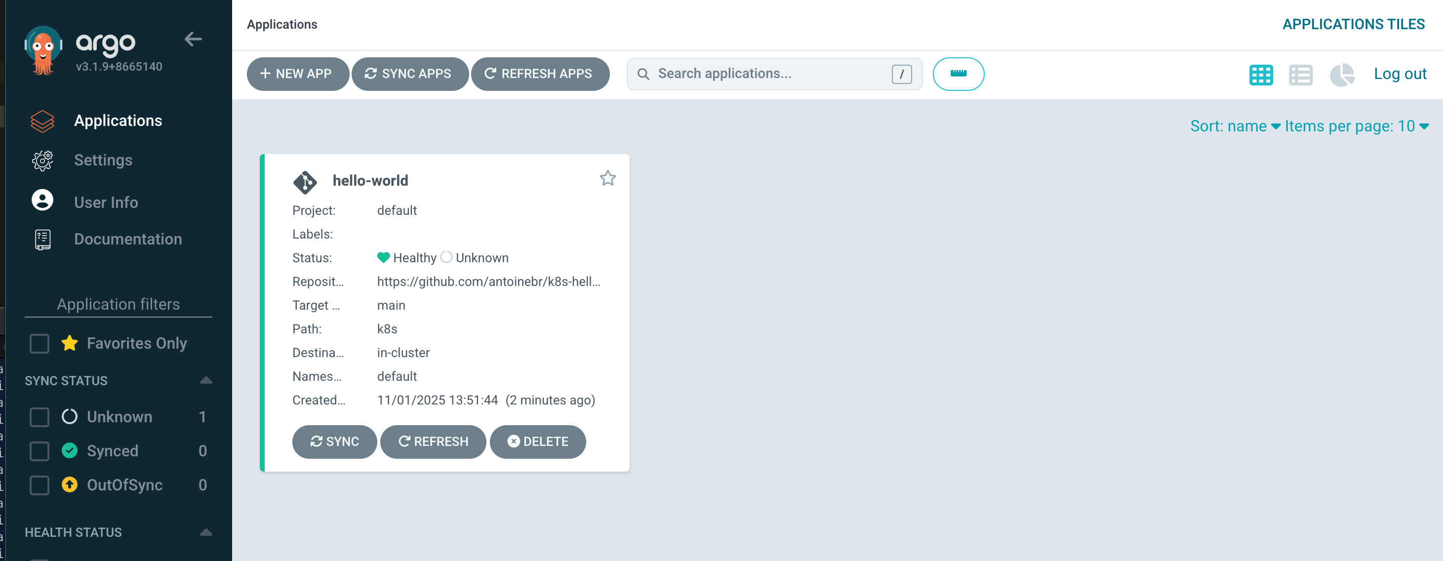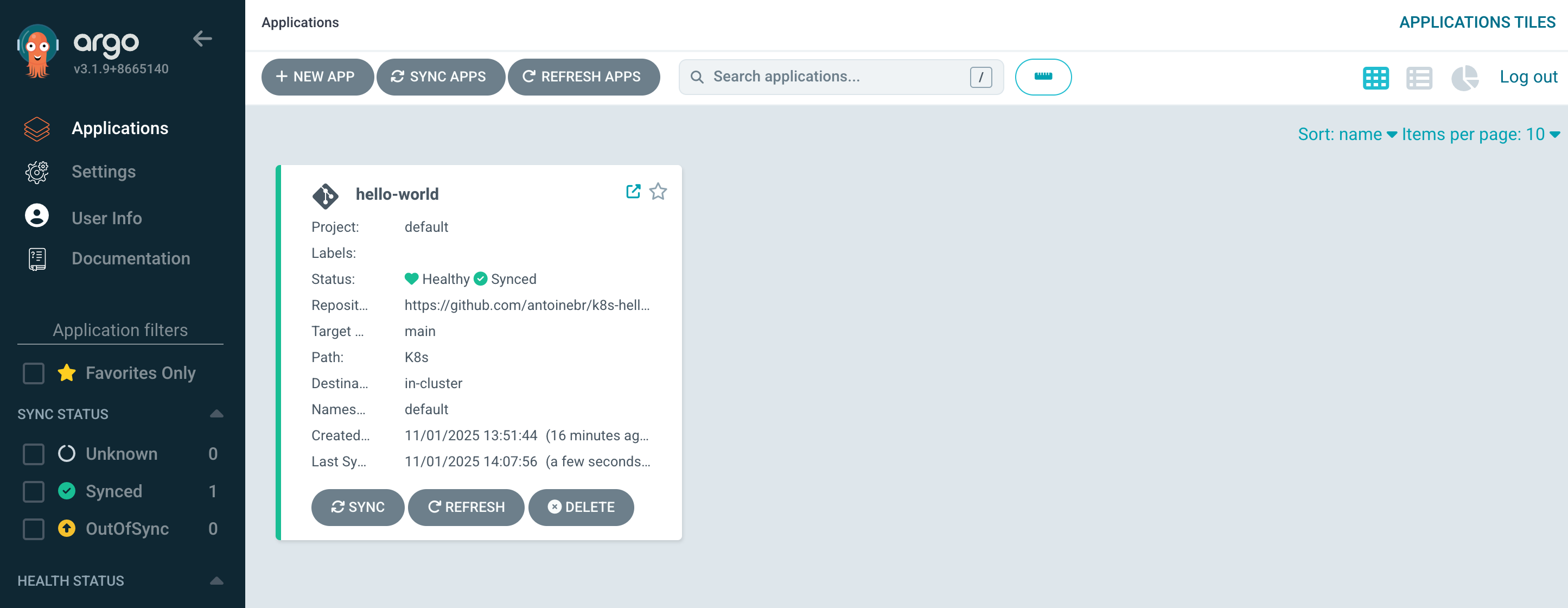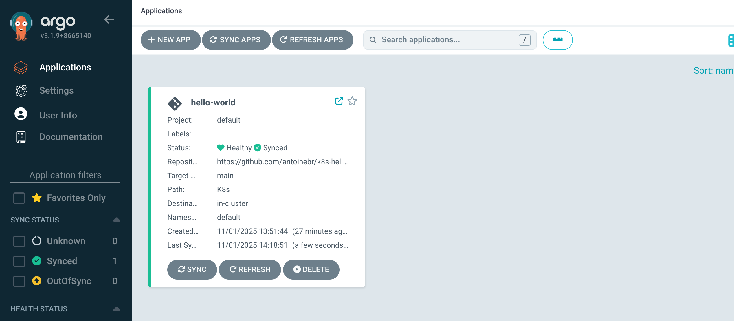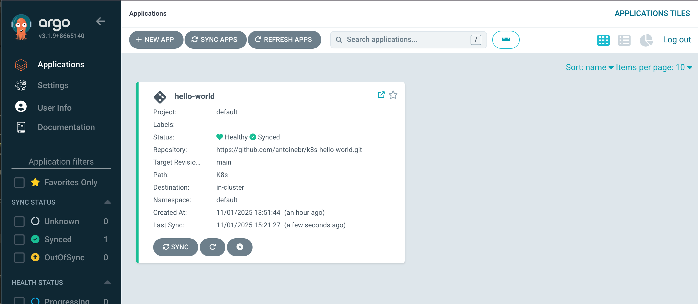 hello-worldapplication change toOutOfSync(because the Gitimage:is now different from the cluster’simage:). -