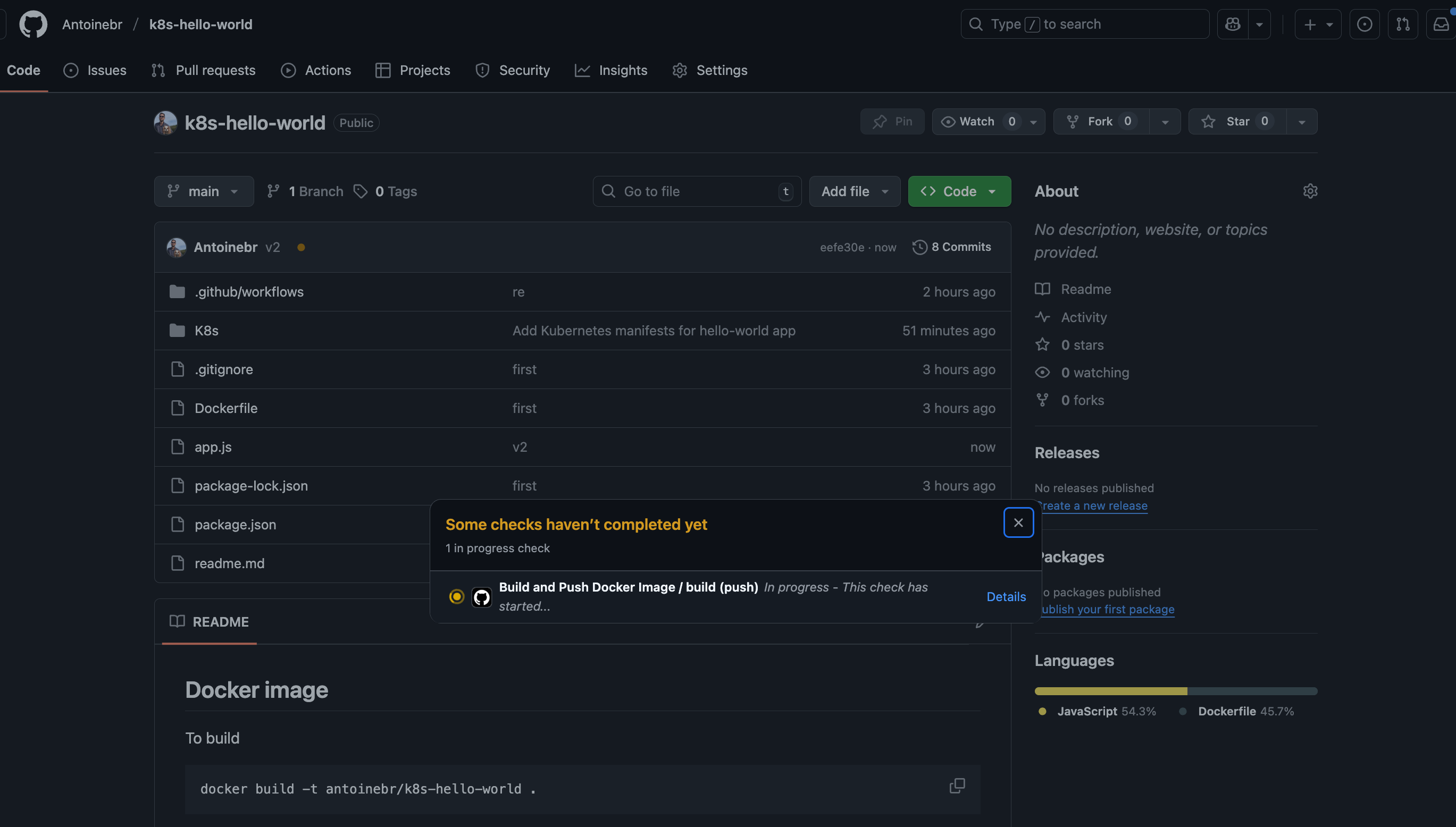 The Robot’s Action (GitHub Actions): The workflow file below will see this v2 tag, build your app, and push the new Docker image: antoinebr/k8s-hello-world:v2.